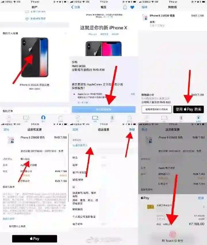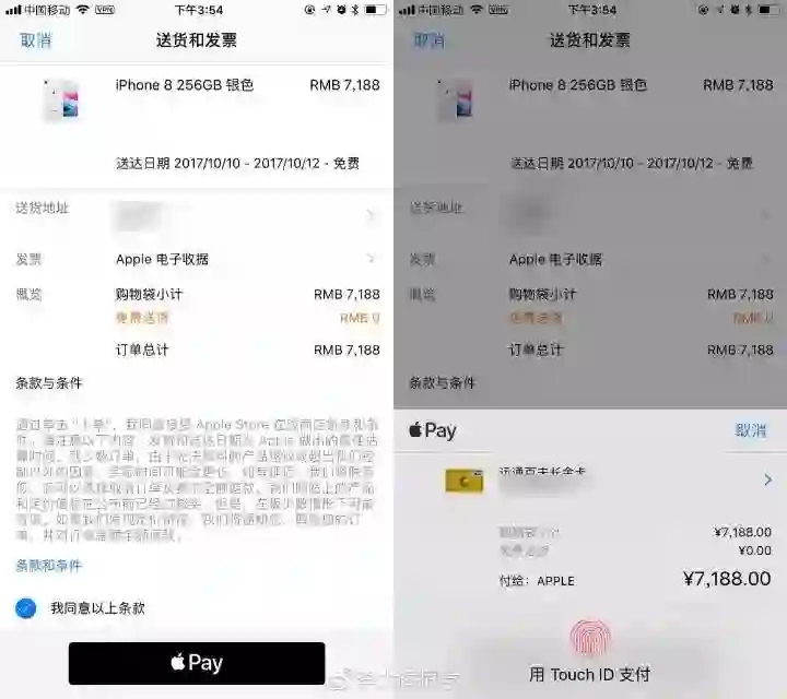 进去以后点击「输入地址」,点击「从通讯录导入」搜索自己的名字导入收货地址,然后手动选择城市和区,点击右上角的「存储」,返回付款页勾选「我同意以上条款」,点击最下面的「Apple Pay」,验证指纹,付款成功。