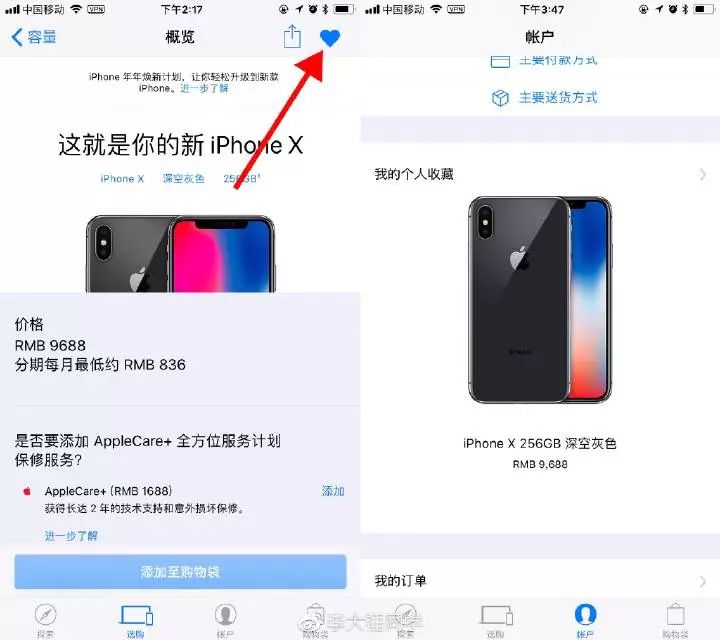 然后在 10 月 27 日苹果下线维护 Apple Store 之前,把想购买的 iPhone X 机型放进收藏夹,这样可以在 Apple Store 下午 3:01 重新上线后迅速找到商品并下单付款。