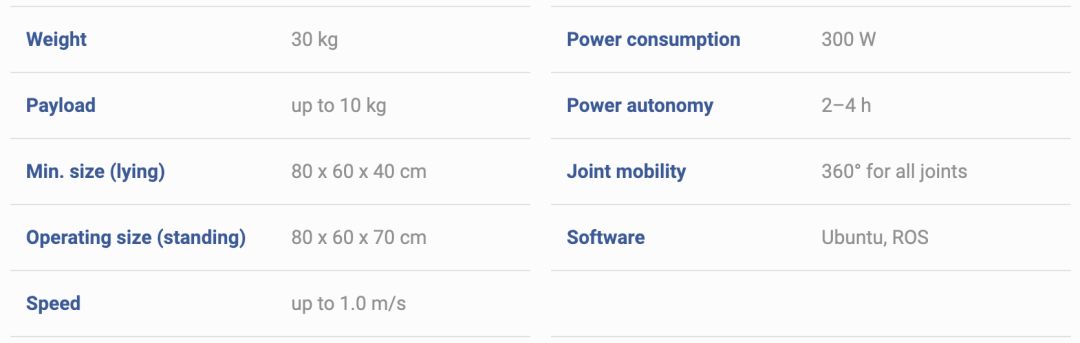 在 ANYbotics 官网上,ANYmal 机器人的部分参数。