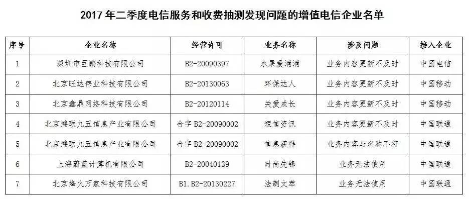 二季度,工信部还组织对三家基础电信企业和130家增值电信企业300项业务进行抽查,发现7项增值业务存在问题,涉及业务内容更新不及时、业务无法使用等已督促整改。