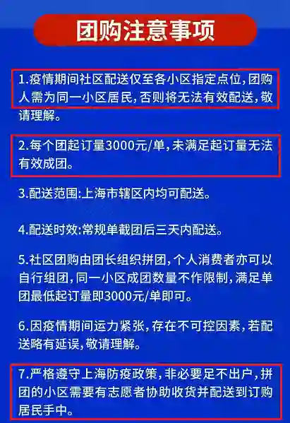 由于运力紧张和管制要求,商家一般会规定团购份数,并配送至小区指定点位,和志愿者对接。