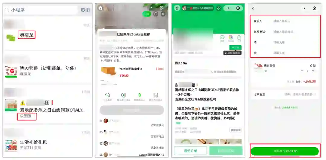 还有一些团购是通过群接龙、快团团等小程序进行的,团购发起人补充商品描述和金额等即可发布,参与人点击参团后可以直接填写信息并支付货款。