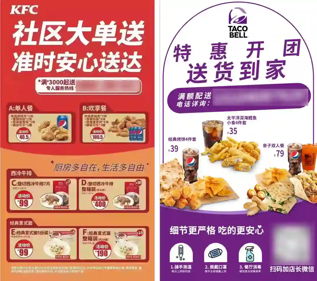 Taco Bell 按照人数,定制了三款套餐,并针对用户“疫情期间注重食品安全”的痛点,在海报上写明了餐厅消毒、骑手测温、佩戴口罩送货等细节。