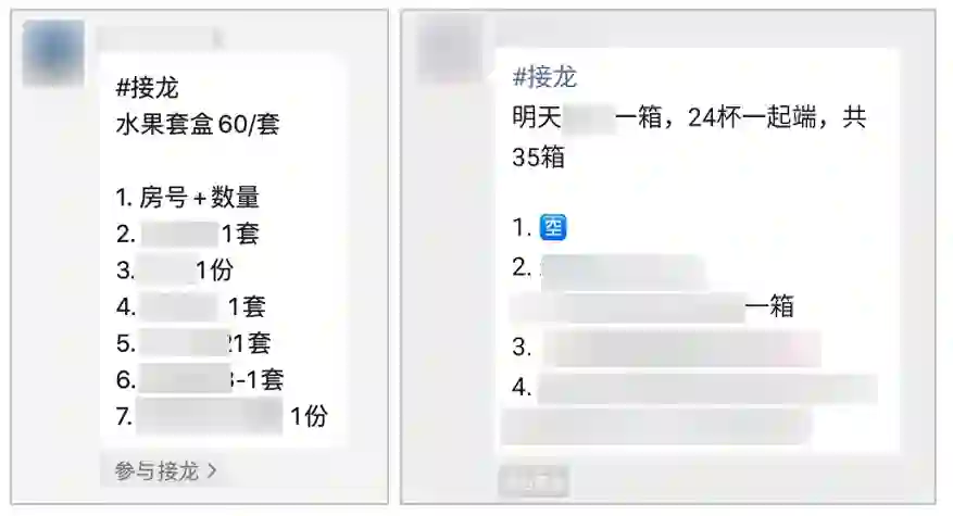 信息接龙是在商家发布商品后,居民通过微信群自带的群接龙工具进行接龙,达到团购份数后即可将需求信息汇总给商家。