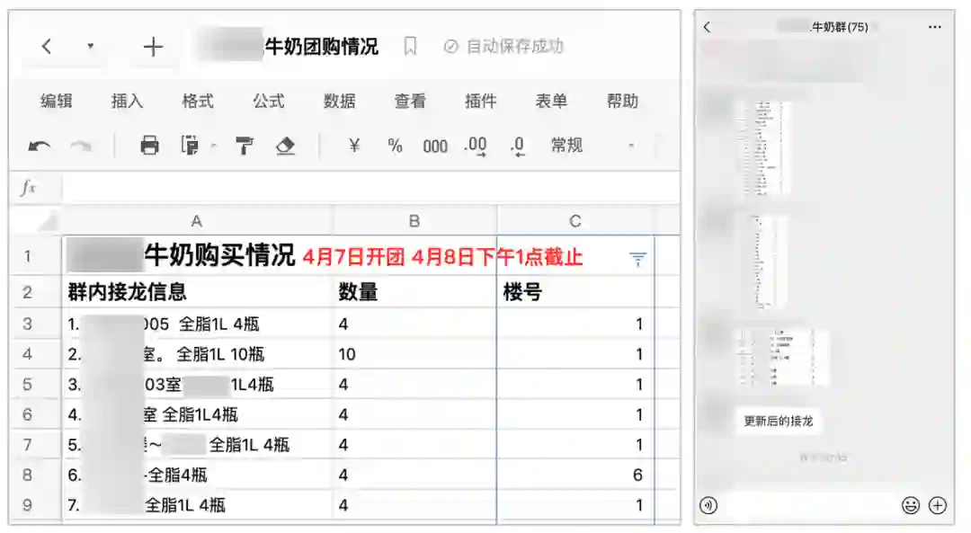 一些团购群中还会通过在线表格汇总接龙信息,方便统计。