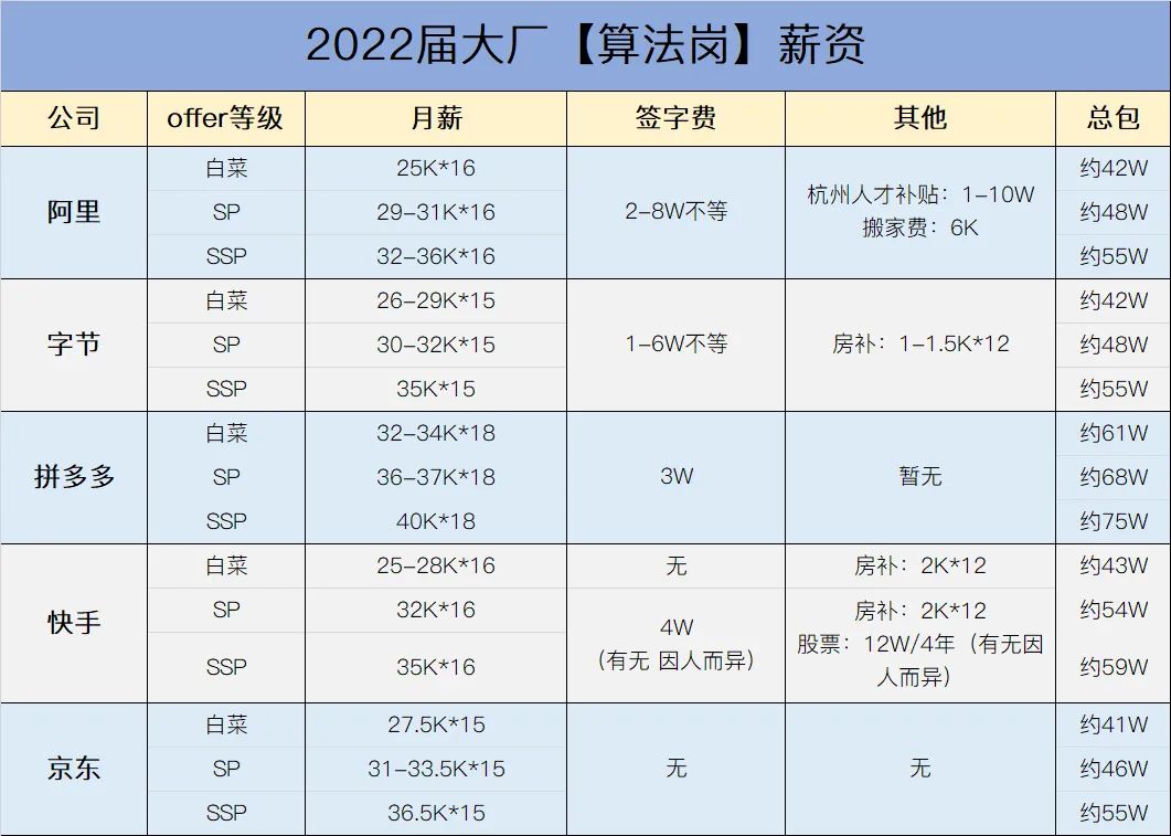对于算法岗来说,一线互联网大厂的白菜档 offer 基本年总包 40 万左右,拿到 sp 或 ssp offer 的同学甚至能高达年总包 50-75 万!