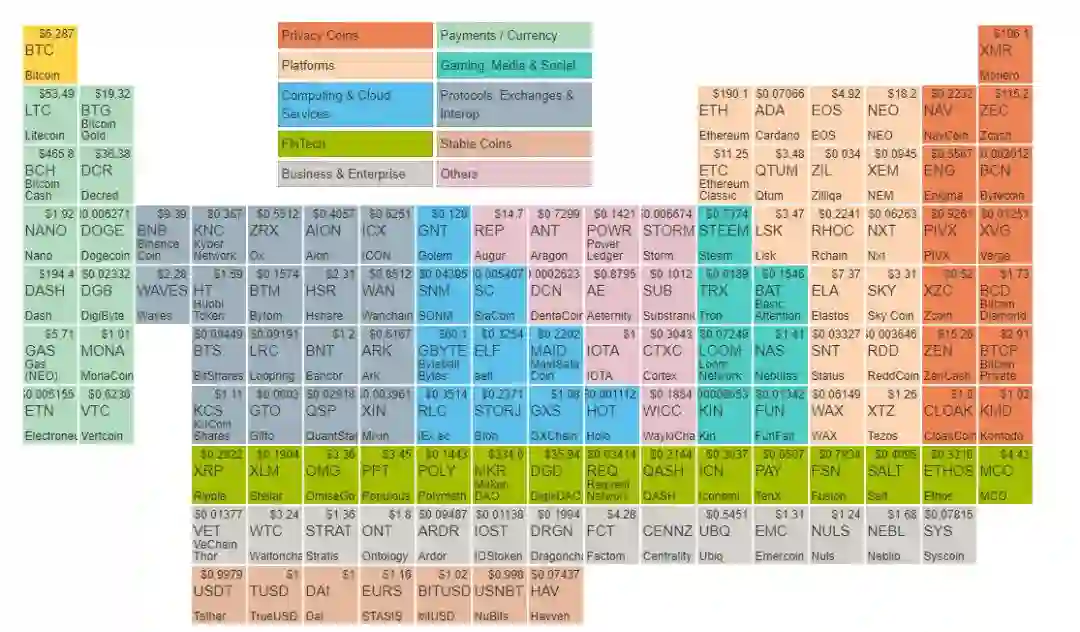氢氦锂铍硼,碳氮氧氟氖……门捷列夫的化学元素周期表对很多人来说应该都并不陌生。化学元素共有118种,而数字货币有成千上万种。如果给数字货币制定一张“周期表”,会长什么样呢?