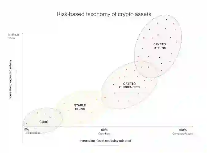 最左下角的集合代表了中央银行发行的数字货币,比如,委内瑞拉发行的石油币、厄瓜多尔发行的厄瓜多尔币。位于该集合内的数字资产不被接纳的风险非常之小,但与之相对应的是,投资这种数字资产的预期收益也是最小的。