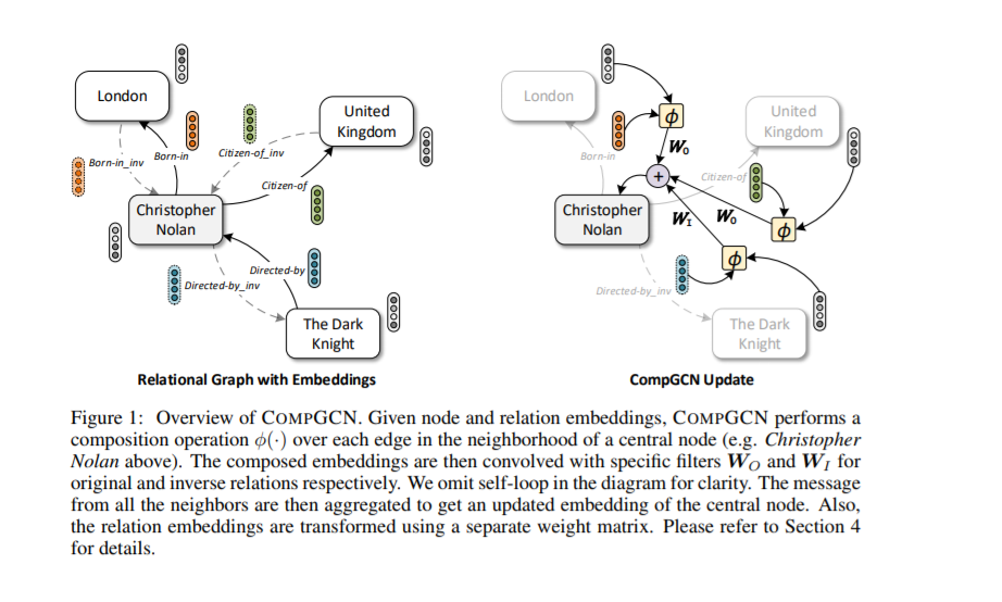 本文作者从实际的图数据特点出发,设计了一种针对多关系有向图的图神经网络 CompGCN 来同时学习节点和关系的表示。同时,为了降低大量不同类型关系带来的参数,这里作者设计了一种分解操作 composition operation,将所有关系都用一组基的加权组合来表示。这样用于描述关系的参数只和基的个数有关。 设计了 CompGCN 模型,一种可以考虑多种关系信息的图神经网络框架,来同时学习节点和关系的表示。证明了 CompGCN 与之前的多关系 GNN 之间的联系。实验验证了 CompGCN 的有效性。