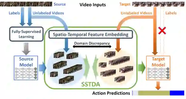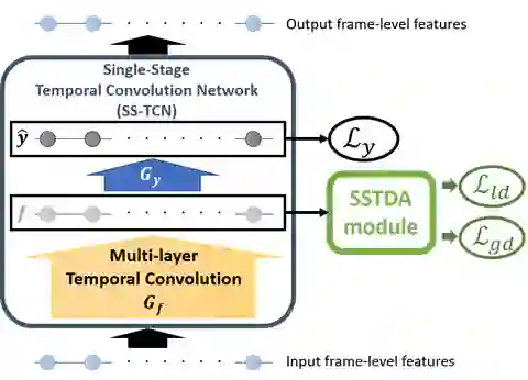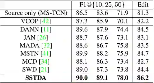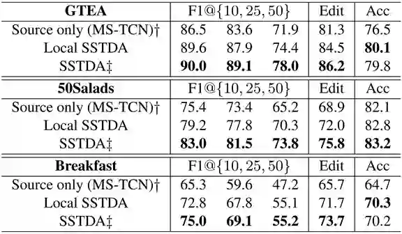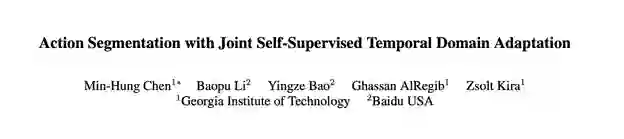 为了解决跨域视频时空变化的问题,百度提出了自我监督的时域自适应(SSTDA),通过两个自我监督的辅助任务,域和顺序域预测,将嵌入局部和全局时间动态的跨域特征空间联合对齐以更好地实现视频动作分割实验结果表明,SSTDA通过更有效地对齐时间动态,优于其他DA方法。在三个公开数据集上的实验表明了本文方法的有效性。主要参考文献:[1]Yazan Abu Farha and Jurgen Gall.Ms-tcn: Multi-stage temporal convolutional network for action segmentation. InIEEE Conference on Computer Vision and PatternRecognition (CVPR), 2019.[2] Dejing Xu, Jun Xiao, Zhou Zhao, Jian Shao, Di Xie, andYueting Zhuang. Self-supervised spatiotemporal learning via video clip orderprediction. In IEEE Conference on Computer Visionand Pattern Recognition (CVPR), 2019.[3] Mingsheng Long, Han Zhu, Jianmin Wang, and Michael IJordan. Deep transfer learning with joint adaptation networks. In International Conference onMachine Learning (ICML), 2017.