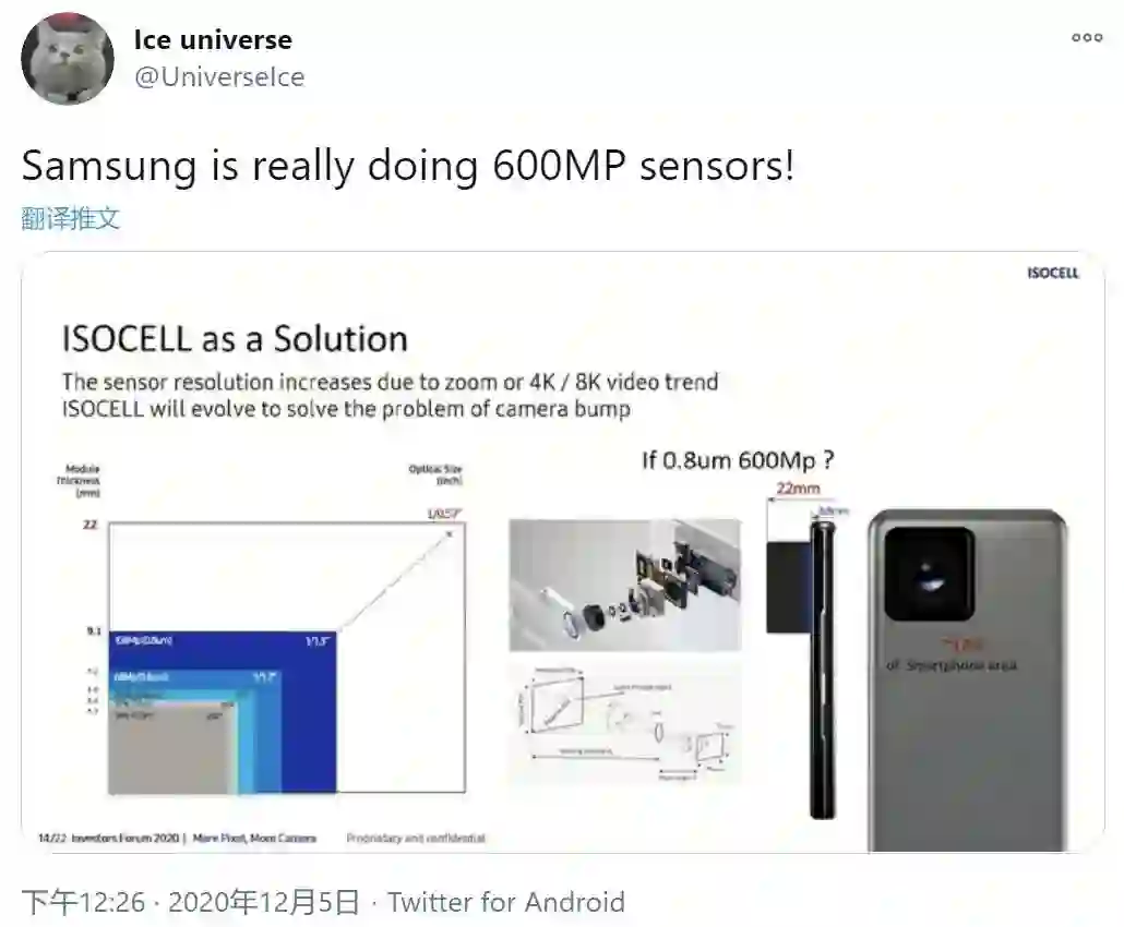推特爆料者 Ice universe 于 12 月 5 日发布一张幻灯片,显示出三星正在研发的一款 6 亿像素相机模组。此款 CMOS 传感器对角线长度高达 1/0.57 英寸,面积比目前最大的手机 CMOS 传感器还要大一倍,甚至超越了 M4/3 微单的 CMOS 大小。此外,该传感器单像素尺寸为 0.8μm。