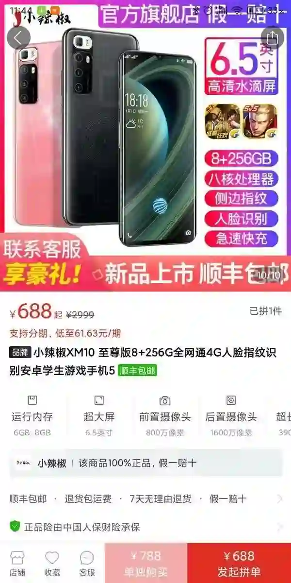 网友发现,在拼多多小辣椒的旗舰店出现了一款新手机,名为XM10至尊版。采用了八核处理器(型号不清楚),6.5 英寸 720P 水滴屏,前置 800 万像素,后置 1600 万像素主摄+3 颗装饰副摄,3900mAh 电池、双扬声器、侧边指纹识别,6+128G透明版的售价为 688 元。总之,这外观也不多说了,各位自行体会吧~