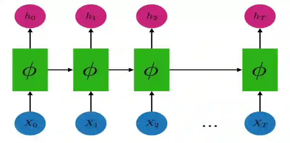 其中 x_t 是时刻 t 的输入,φ 是可微分映射,h_0 是初始状态。在一个最原始循环神经网络中,该模型由矩阵 W 和 U 参数化,并根据下式更新状态: