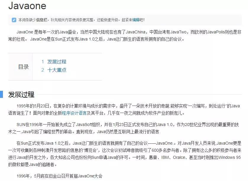 每年一次的Java盛会,当然中国大陆现在也有了JavaChina,中国台湾有JavaTwo,而欧洲的JavaPolis则也是非常的壮观。 JavaOne是在Sun正式发布Java 1.0之后,Java这门新生的语言所拥有的自己的会议。