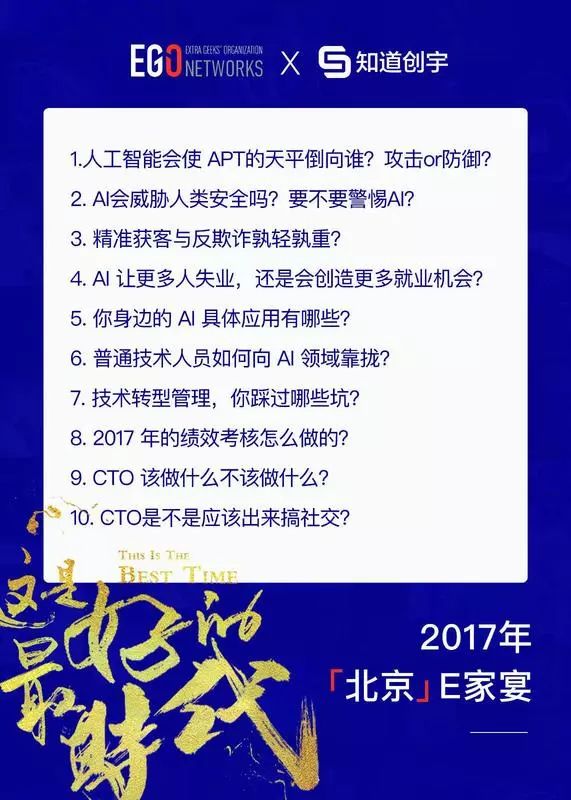 2017 年是技术蓬勃发展的一年,人工智能等新兴技术改变着我们的生活。我们不禁感慨,这是最好的时代,这是技术人改变世界的时代!所以,2017 年度 E 家宴的主题就被定为《这是最好的时代》,我们希望通过技术人的成长经历,洞悉时代的发展脉搏。同时我们也不能忽视,技术的发展也存在隐忧,安全技术力量比较薄弱的中小企业无时无刻不面临着安全威胁。知名安全企业知道创宇作为本次活动的独家赞助商,为参会者带来了最新的安全形势分析和技术展示,为企业发展保驾护航。
