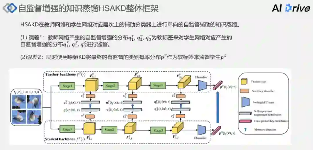 上图展示了自监督增强知识蒸馏框架:HSAKD 的整体的流程。
