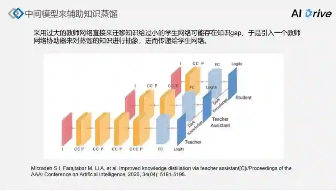 有一种比较好的方法就是:基于一种观测,即采用过大的教师网络直接来迁移知识给过小的学生网络,可能会存在一种支持 gap,于是引入网络协助器来对蒸馏的知识进行抽象。这个网络协助器,通常是介于教师网络和学生网络之间规模的模型,然后该模型可以对教师知识进行一定程度的抽象,再传递给学生网络。