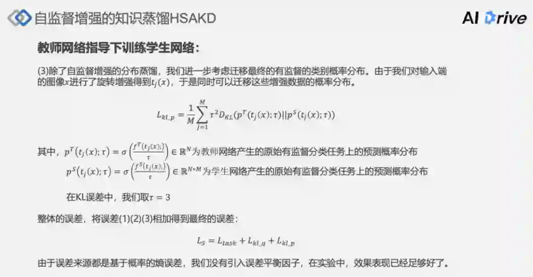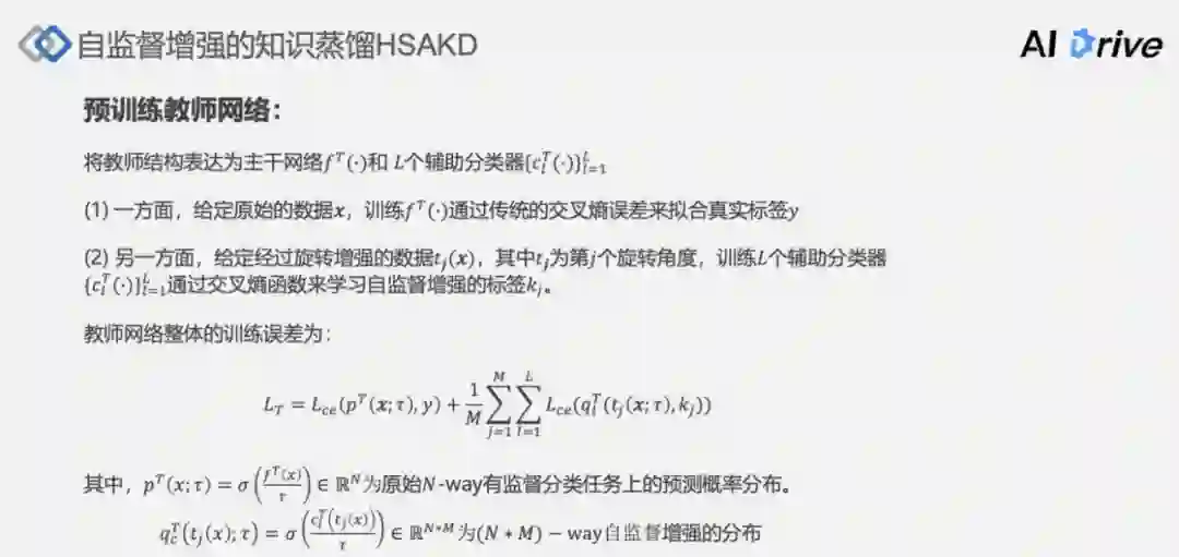 这里 PT 是指原始的 N 维有监督分类任务上预测概率分布,qT 的话就是为 N*M 维的一个自监督增强的分布,预训练教师网络之后,可以用教师网络进一步指导训练学生网络。