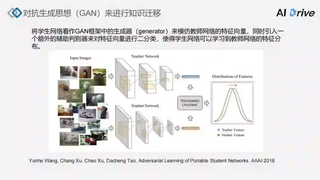 第一种最常见的方式是采用 KL divergence 和 L2 误差的方式,分别对概率分布和特征图信息作为一种逼近手段;第二种是从模型的角度,在教师和学生之间引入一个中间模型。第三种,可以利用对抗生成的思想来依次进行知识迁移。