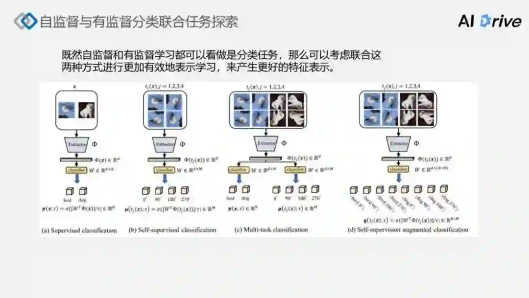(c)是联合有监督和自监督的一种学习方式,在这里它们两者采用了共享的特征提取器,在分类尾部是采用了不同的分类头,左侧是一个有监督的分类头,用来分类不同的目标,右侧是一个自监督的分类头,用来分类这个目标的旋转角度,这两个分类任务是同时进行、学习共享的特征提取器。