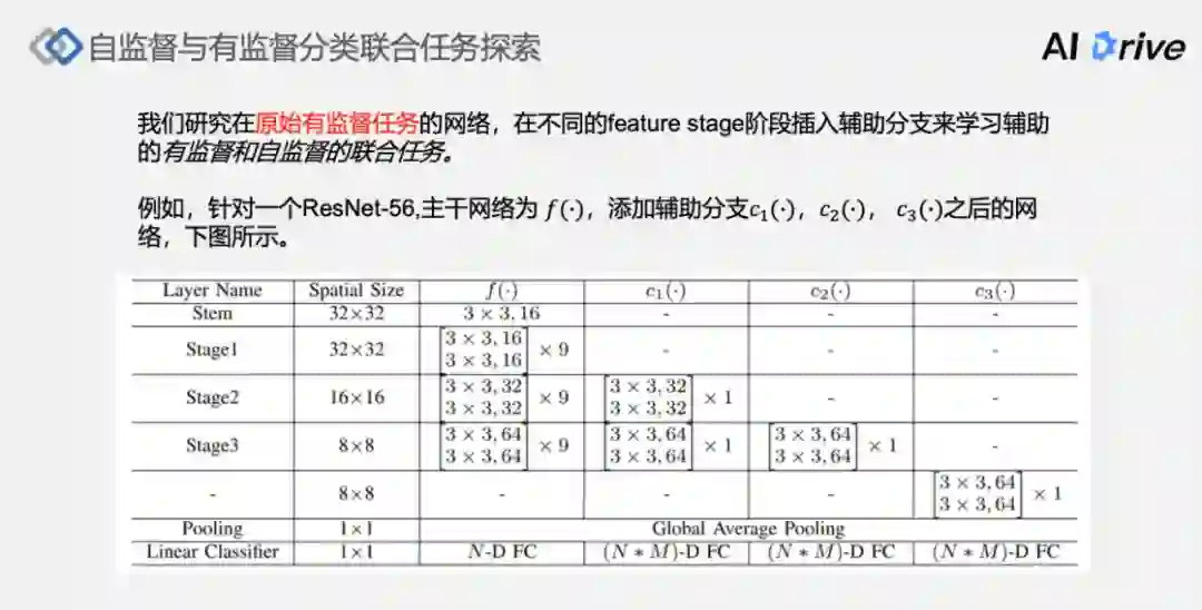 例如,针对一个 ResNet-56 为例,将主干网络表达为f(·),并且添加辅助分支C1(·),C2(·),C3(·),主干网络还是学习原始的有监督的分类任务,辅助分支学习提出的一些有监督结合的一些任务,从而研究无监督任务对有监督任务的一个表现的增益。
