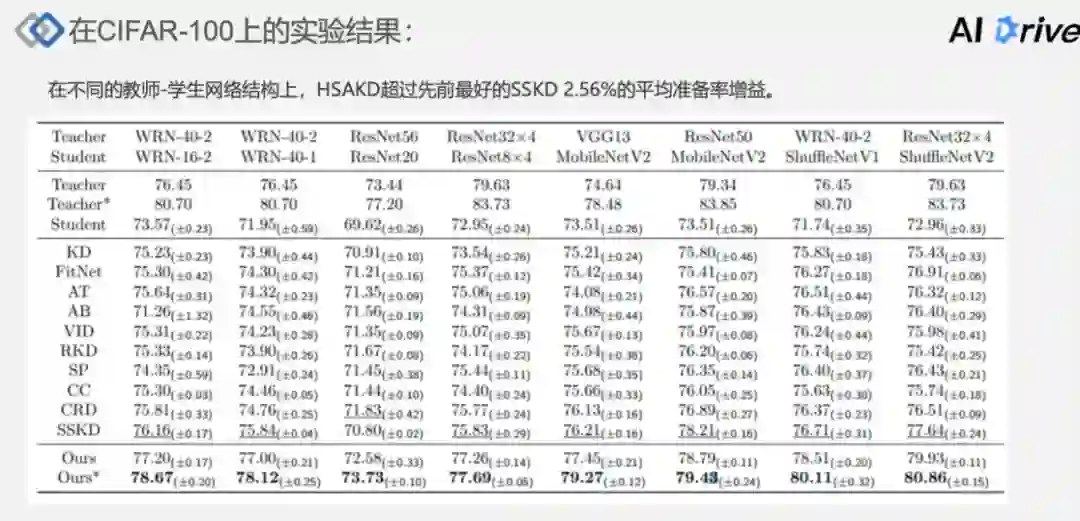 3. 实验结果:HSAKD 显著地超过了先前基于自监督知识蒸馏方法 SSKD。同时利用自监督表示学习来进行 知识蒸馏通常也能使得网络学习到更容易泛化的特征表示,有利于下游的语义识别的任务。