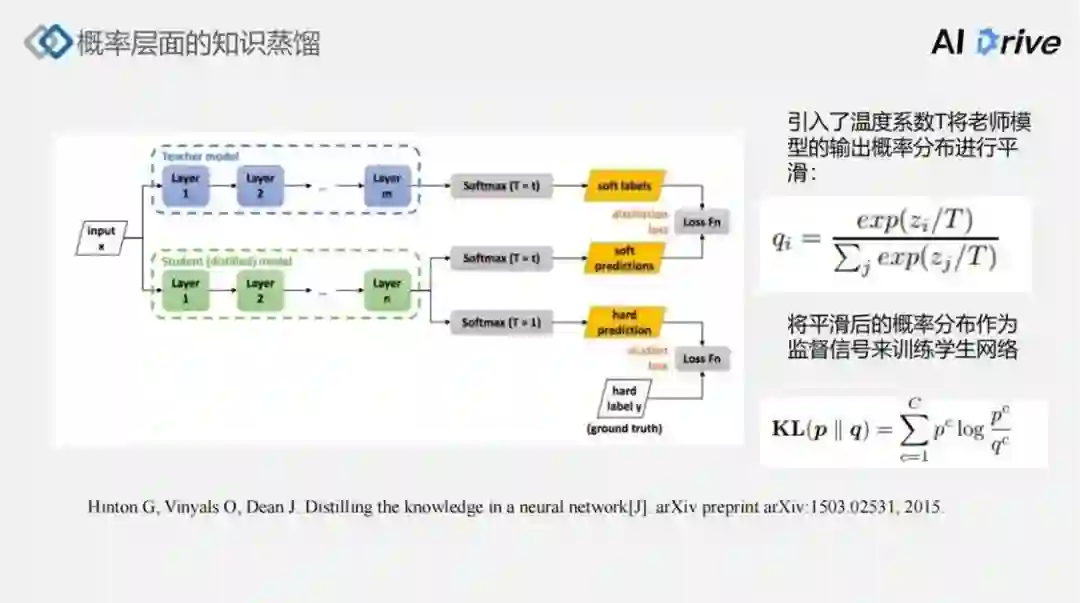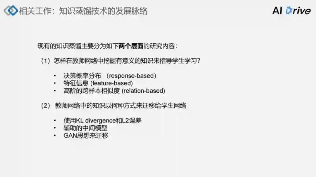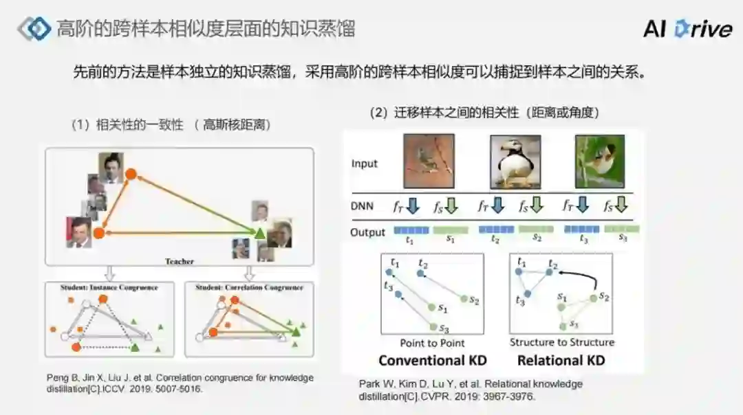 通常可以概括为三个层面:第一个层面是决策概率分布,response-based;第二个是特征信息,feature-based;第三个是高阶的跨样本相似度关系,relation-based。
