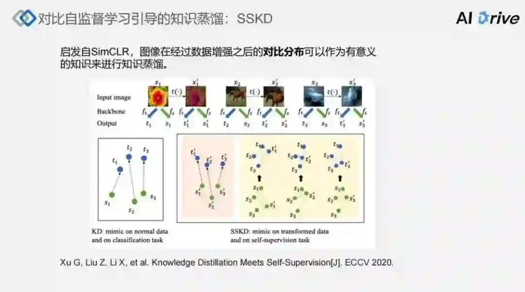 SSKD 是一种将自监督知识引入有监督知识蒸馏的方法。SSKD 启发自 SimCLR,它将图像在经过数据增强之后的对比分布,可以作为有意义的知识形式来进行知识迁移。