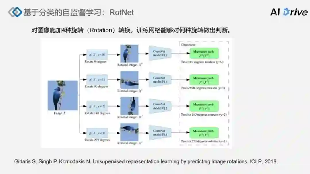 第一个基于分类的自监督学习模式的代表工作 RotNet。该方法是对输入的 Image X,施加四种转换,分别是零度(零度代表对图像没有变化)、90 度、180 度、270 度,最后进一步训练网络对输入的图像做何种旋转做出判断。