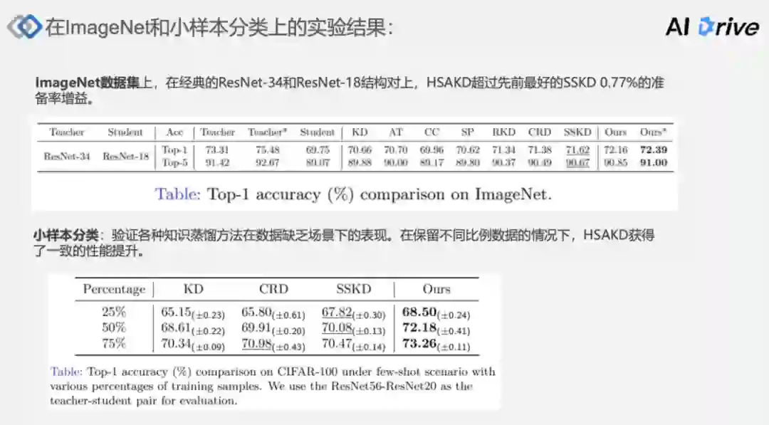 (1)在ImageNet 数据上,在经典的 ResNet-34 和 ResNet-18 结构对上,HSAKD 超过先前最好的 SSKD 0.77% 的准确率增益。