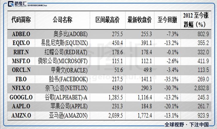 对于大部分投资人而言,这表里面前5个公司,除了微软,其他几个估计都没怎么听过。毕竟2B型科技公司曝光度相对于2C型的差别太大,但其中的优质公司涨幅也是相当好的,可能相对于2C明星企业爆发力弱,但是走的相当稳。这里面的有些公司也有国内的对标标的,但是质地如何需要投资者自己去判断。