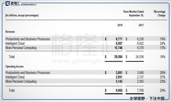 生产力与商务业务主要包括各种版本的Office授权、LinkedIn;Q3营收同比增长19%,营业利润同比增长29%。