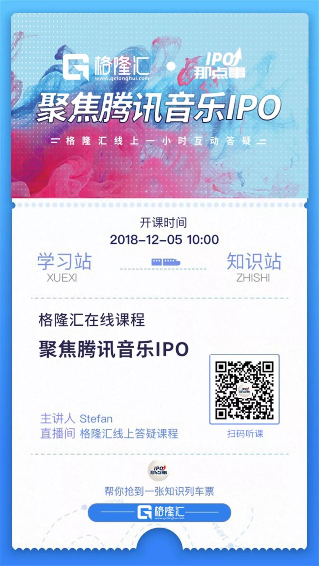 周三上午10:00-11:00,IPO那点事 将举办一场主题为"聚焦腾讯音乐IPO"的线上答疑课程,关注公众号“IPO那点事(ID:ipopress)”,微信后台回复“腾讯音乐”,即可预约进入课程直播间。点击下图查看活动详情:
