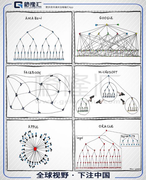 而且当时微软不仅新业务上不利,公司文化氛围也是僵硬,充满内斗。程序员兼漫画家Manu Cornet曾在2011年用漫画总结了不同科技公司的组织架构图,图上,微软的各个部门之间举枪相向。