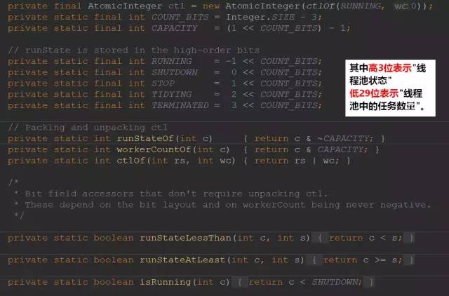 变量ctl定义为AtomicInteger,记录了“线程池中的任务数量”和“线程池的状态”两个信息。