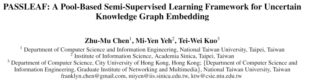 论文引用:Citation: Chen, Z.M., Yeh, M.Y. and Kuo, T.W., 2021, May. PASSLEAF: A Pool-bAsed Semi-Supervised LEArning Framework for Uncertain Knowledge Graph Embedding. In Proceedings of the AAAI Conference on Artificial Intelligence (Vol. 35, No. 5, pp. 4019-4026).