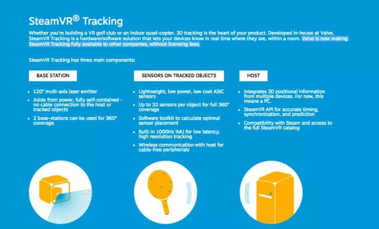 在其授权页面上,雷锋网发现这样一段话:所有公司都能使用Valve Steam VR的追踪技术,不收取任何授权费用(Valve is now making SteamVR Tracking fully available to other companies, without licensing fees)。