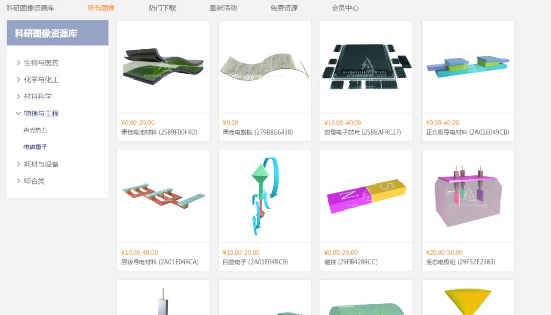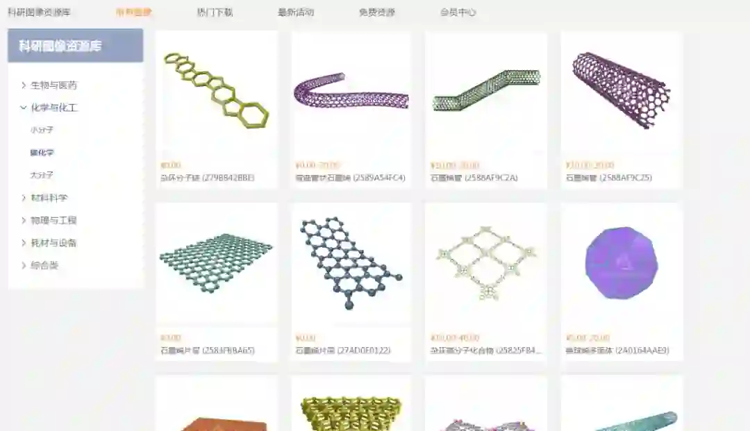 资源库拥有的图像模型涵盖了「生物与医药」、「化学与化工」、「材料科学」、「物理与工程」、「耗材与设备」、「综合类」六大学科。