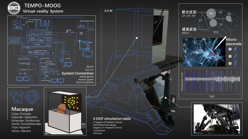 为了研究前庭觉与视觉是如何影响我们空间感知的,我们实验室建立了一套前庭-视觉虚拟现实系统。这套系统由两部分组成,分别是负责提供空间信息的 MOOG 系统,和负责控制指令的 TEMPO 系统。MOOG 系统主要包括一个六自由度的运动平台,它通过平台的真实运动提供前庭感觉,通过显示器的光流信息模拟视觉的刺激。猕猴在实验舱内或者根据单一的视觉刺激,或者根据单一的前庭刺激,或者根据两种刺激的不同组合来做行为任务。而 TEMPO 系统则负责实时控制这些刺激的给出以及记录猕猴的行为结果。