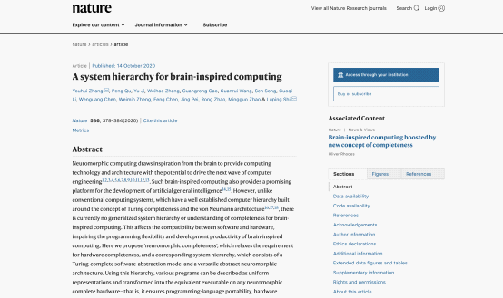 被郑院士点名的这篇论文,昨天晚上也就是10月14日,被《自然》刊发。这篇题为《一种类脑计算系统层次结构》(A system hierarchy for brain-inspired computing)的论文,由清华大学计算机科学与技术系(以下简称“计算机系”)张悠慧团队、精密仪器系(以下简称“精仪系”)施路平团队与合作者共同完成,清华大学计算机系是第一完成单位。