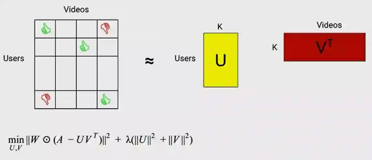 在这里会得到一个非常稀疏的矩阵,注意矩阵是稀疏的,所以不是所有的视频都会得到所有用户的评分。可以用于解决诸如你应该向用户推荐哪个视频,或者找到用户相似或视频相似性的问题。现在,这通常是通过把这个巨大的矩阵分解为由两个密集因素组成的产品。