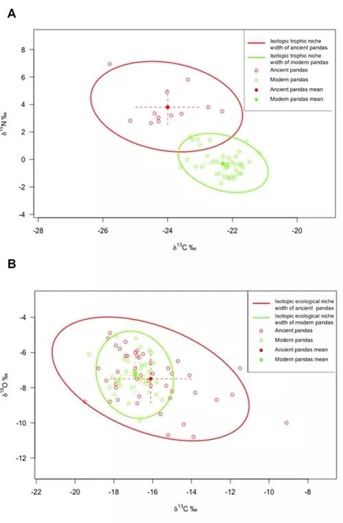 A:历史时期(红色)和现生(绿色)大熊猫碳氮同位素营养生态位椭圆;B:历史时期(红色)和现生(绿色)大熊猫碳氧同位素生境生态位椭圆。