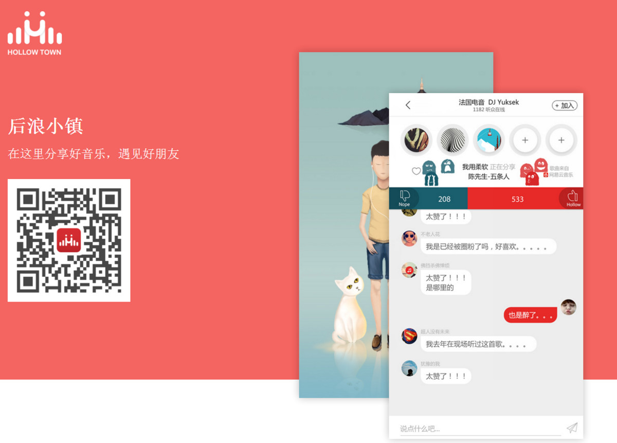 “后浪小镇”的模式与Lisn类似,用户可以在网易云音乐或虾米音乐上选择歌曲,然后分享到“后浪小镇”的群聊天室,让入群的小伙伴们一边听歌,一边聊天。