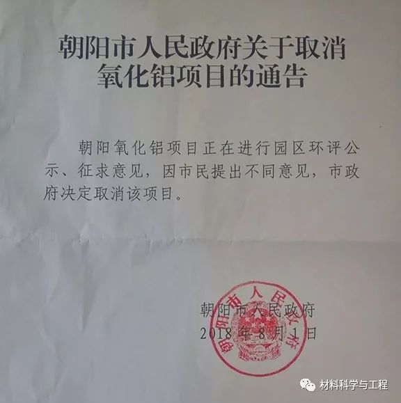 8月1日,辽宁朝阳市政府发布公告,决定停止“朝阳氧化铝项目”。公告发布几个小时后,朝阳市政府就对公告内容进行了修改,将“停止”一词改为了“取消”。