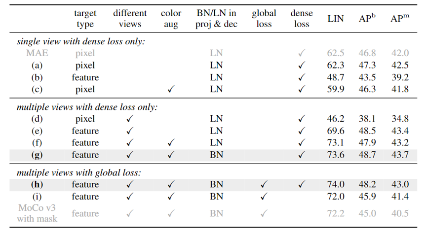 对 projector 与 decoder 使用 BN 还是 LN。研究者尝试将 projector 和 decoder 中的归一化层从 LN 换成 BN,表中(fg)说明这种替换对线性分类与检测任务都有一些提升;
