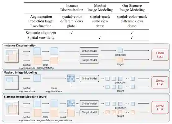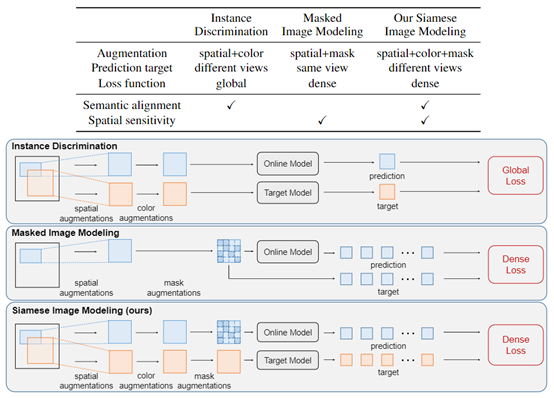 对于本文提出的全新自监督学习方法 Siamese Image Modeling 中,网络从同一图像的遮盖视图预测另一个增强视图的密集特征,使其兼顾 Instance Discrimination 方法的语义对齐能力和 Masked Image Modeling 方法的空间分辨能力。