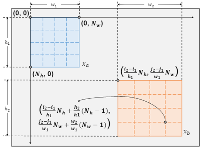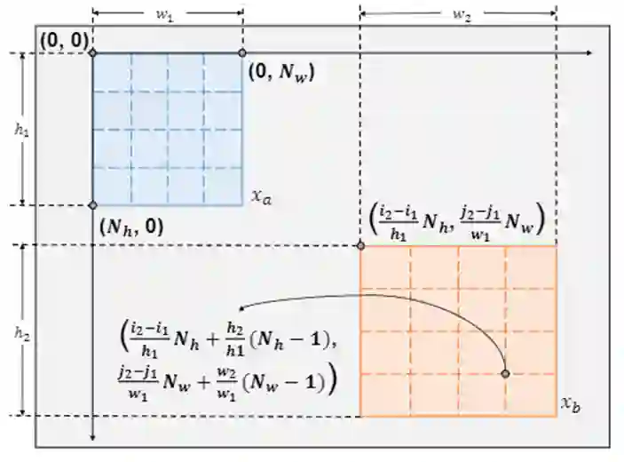 最后介绍解码器所需的位置编码是如何计算的。所有的图块都是以第一张视图 x_a 的左上角作为原点来计算的。具体来说,假设两张视图在原图中的位置信息分别为 (i_1,j_1,h_1,w_1) 和 (i_2,j_2,h_2,w_2 )(分别代表左上角横纵坐标与高度宽度),第一张视图的相对位置为: