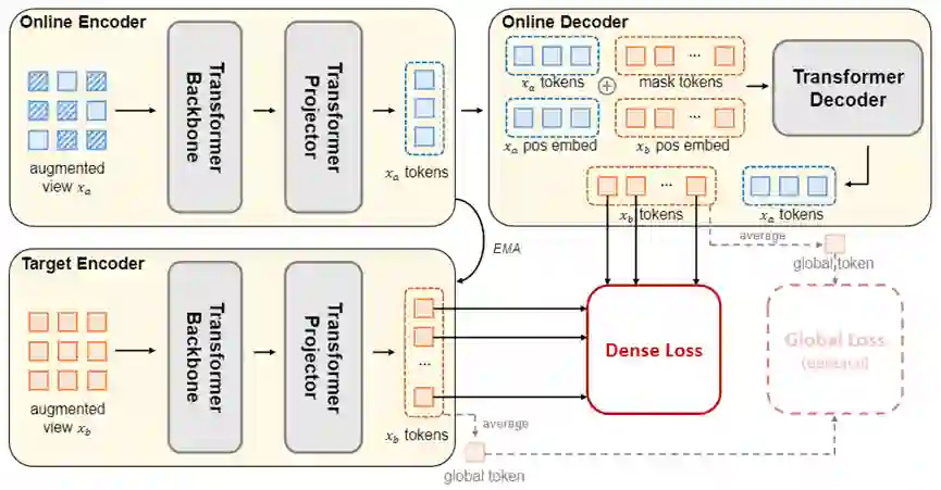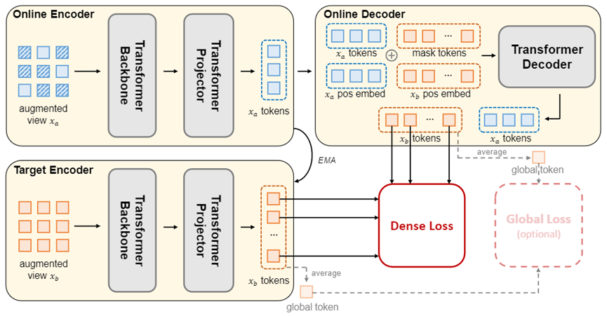 Online 分支负责做出预测。它首先将第一张遮挡视图 x_a 映射成特征 y_a∈R^(N_v×D),之后利用解码器 g (⋅) 基于特征 y_a,掩码词符 m 和他们的位置编码来做出预测