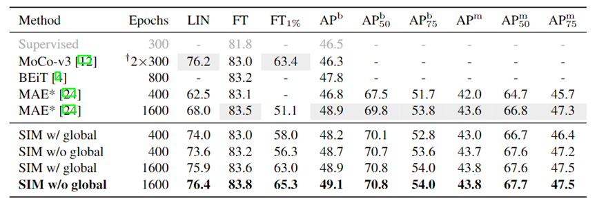 线性分类方面,SIM 可以做到和 MoCo-v3 相当的水平,同时大幅超过 MAE(400ep 大约 11 个点,1600ep 大约 8 个点);同时,即便不使用全局损失函数,SIM 也能给出不错的线性分类结果;