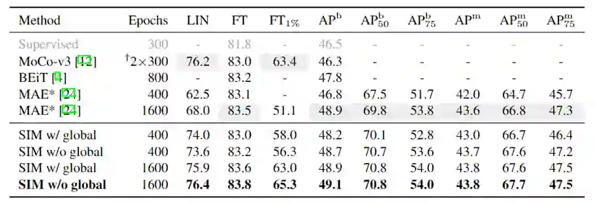 检测与分割任务上,SIM 超过了 MoCo-v3 大约 2 个点,也能在使用更短轮数的条件下达到与 MAE 相当的水平(400ep v.s. 1600ep);